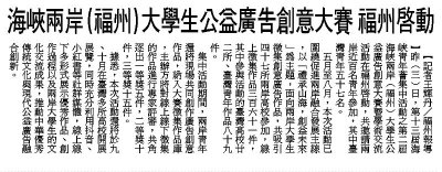 【記者王輝丹/福州報導】昨(三)日,第十三屆海峽青年薈集中活動之第二屆海峽兩岸(福州)大學生公益廣告創意大賽暨學術交流活動在福州啟動,共邀請兩岸近百名青年參加,其中臺灣青...[詳情]
