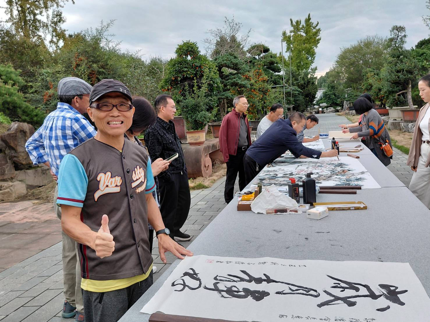 除了茶道專家,也有書畫家共襄盛舉,就著現場飄散的茶香花香,吟詩寫字,作畫填詞,把茶飲文化提升到一個無比崇高的境界。詩人畫家轉身歇筆,又拿起一杯茶,幾次黃湯下肚,文思泉湧,創意無限,茶湯可以說是藝術創意的催化劑。而且行程之中除了品茗對飲,和開筆書畫觀摩,還有數次室內或戶外的筆會寫生,兩地畫家可以共同創作一幅捲軸,兩岸書家可以前後賦詩其上,彼此唱和。其間大可互敬一杯茶水,兩岸兄友弟恭,和樂融融。反正有了茶喝,話題自是不斷。在戶外任意揮毫時還有些不請自來的,隨著茶香蜂湧而至,蚊蠅蟲蝶都來相伴或干擾,但都不妨,不礙心中那種,以文會友,以友輔仁的熱切願念!尤其是每每常在晚餐之後,也無意上街採買遊覽,只想回到大廳長桌,攤開宣紙,繼續書畫的創作,或是探討琢磨,或是互贈書作,少不了都有一杯好茶案前相伴,唇齒留香,談興濃厚。原來文人雅士齊聚一堂,大家的興致和文采,更是格外的高昂熱烈!