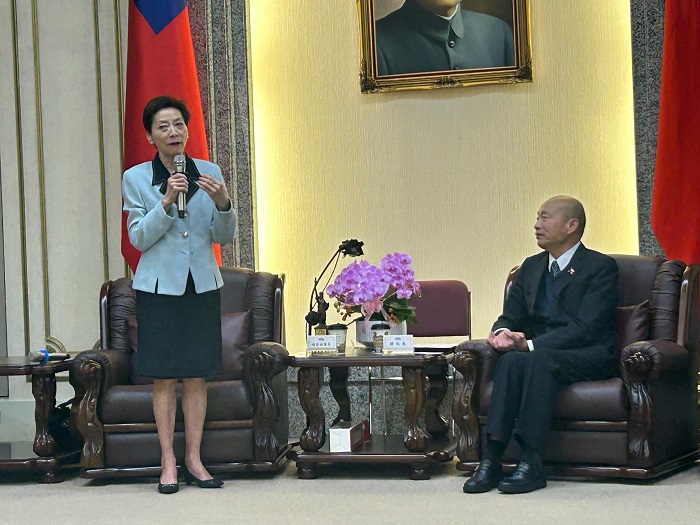 圖說:立法院長韓國瑜親切接見旅美僑胞參訪團,北美僑領楊愛倫(左)致詞,共話台灣及兩岸發展與僑胞尋根事宜。