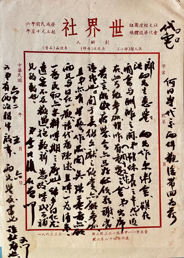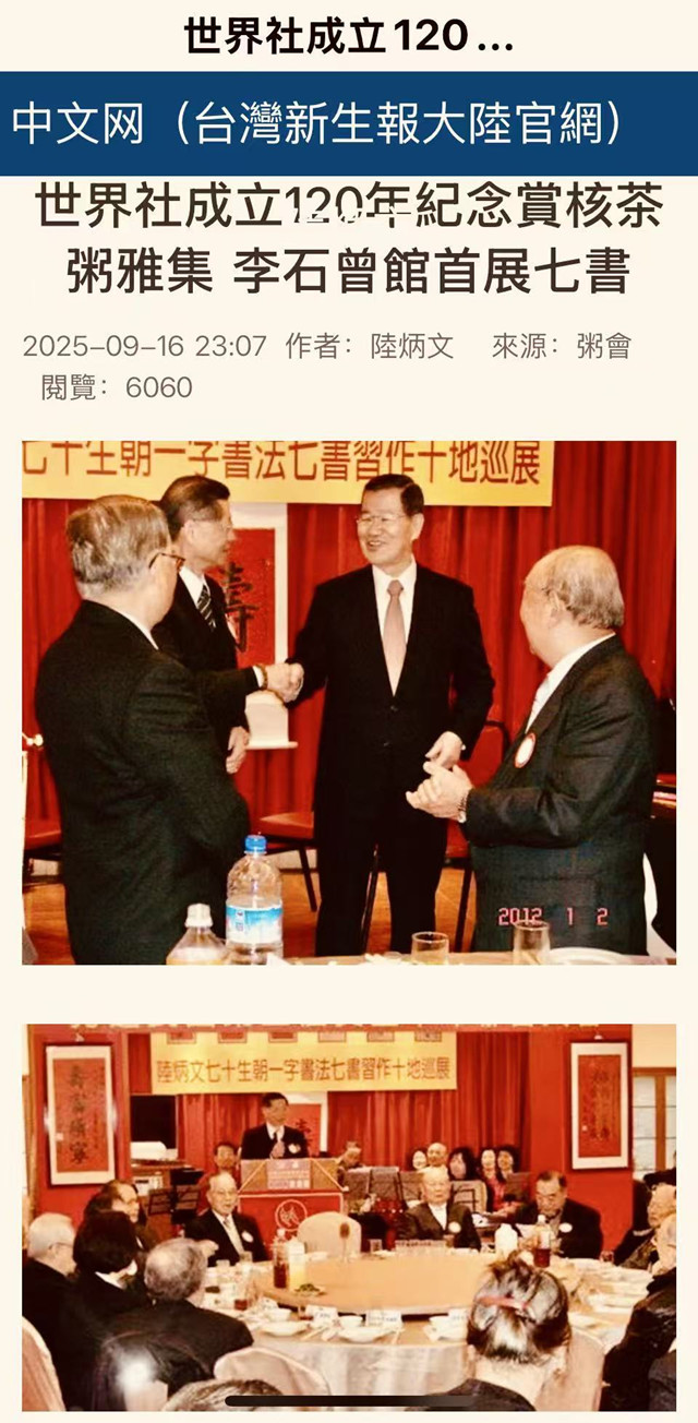 「風雨同舟」立軸水墨紙本,則由大陸中國嘉德相中,登上2014年春季北京拍賣會,落錘價遠高於底標價人民幣20萬元。陸炳文主持的粥文化資產存藏中心,何其有幸多年前亦從古文物市場,蒐羅到楹聯另一件姐妹作、李石曾同樣四字「風雨同舟」法書,今日世界社慶“九一九”前夕,秉公懷想“九一八”不免懷舊,而首在中文網/臺灣新生報大陸官網上,公開披露此一墨寶,併同其他文獻文物。