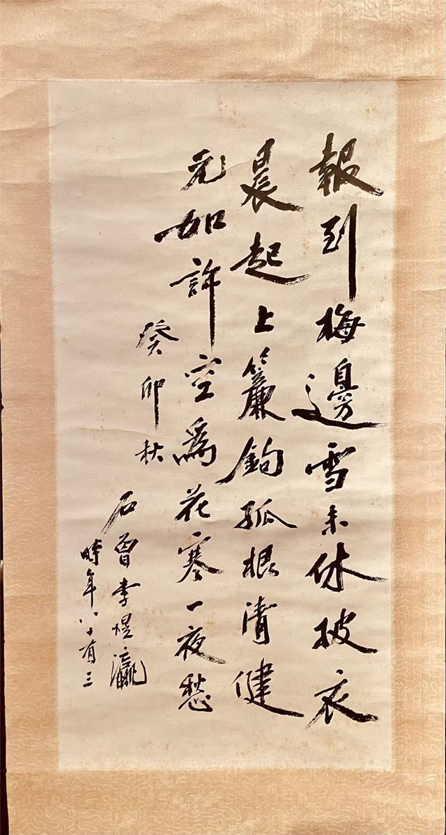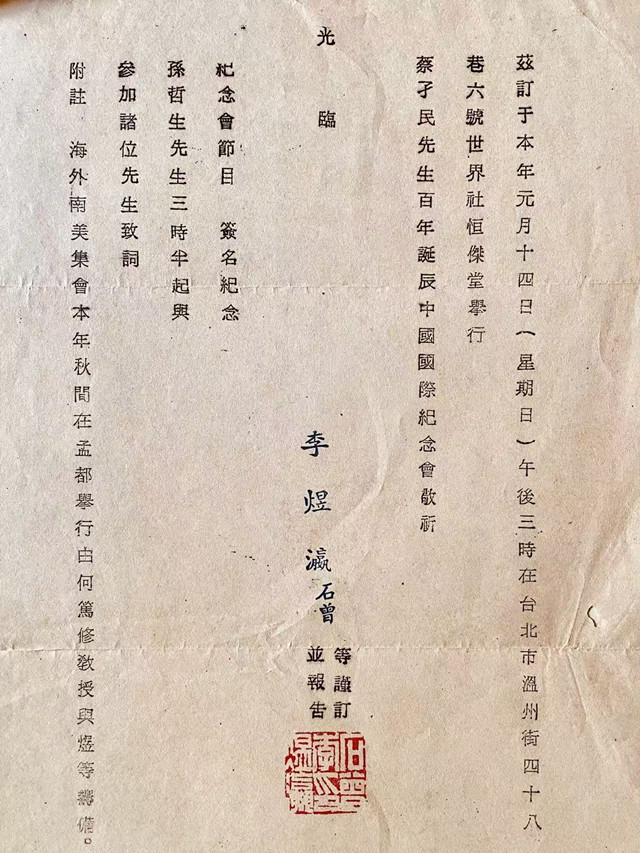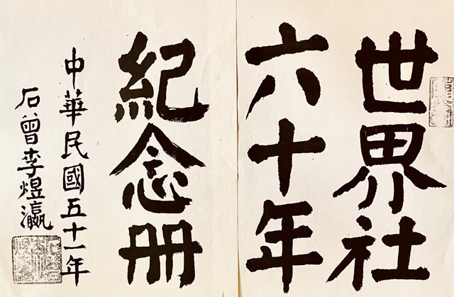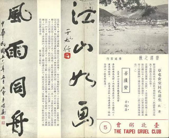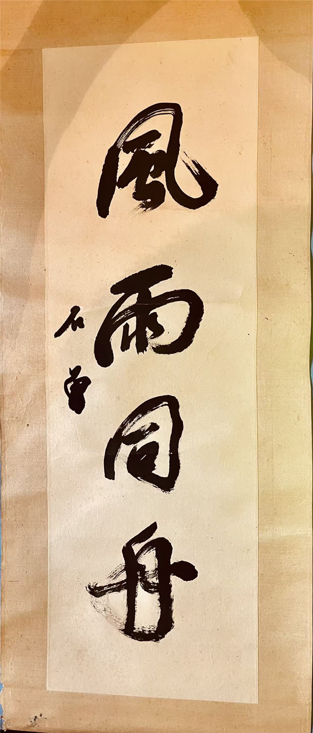 抗戰勝利光復臺灣,轉眼之間又是80年。臺灣光復後27載的1962年5月,國民黨四大元老[内含吳稚暉(敬恆)、張靜江(人傑)之一,早年發起在歐陸巴黎創立世界社、和組織赴法勤工儉學運動的李石曾,書作「風雨同舟」四字被送做堆,與革命元勲于右任行書「江山如畫」,配對成為四言聯之下聯,嗣再收納編入《竹屋竹联》(臺北粥會出版品第5號,1974年印行)。