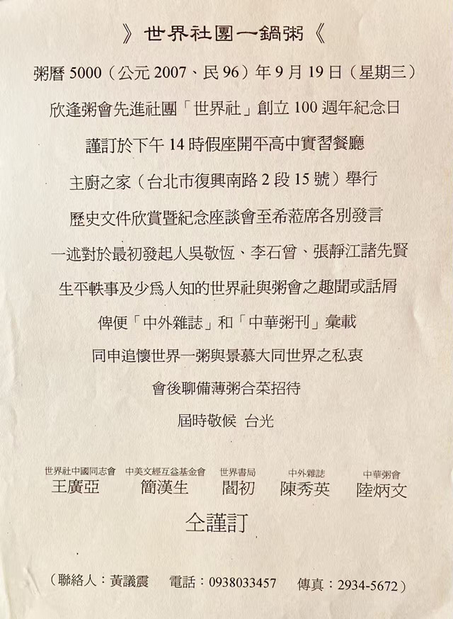 何以黨主席候選人,需要如此特别表態,因為國民黨欠世界社、昔日一筆豆腐錢未還!大家都知道,文化人士雅集粥會前身乃世界社、革命學術團體世界社延續到粥會;換一句話說,粥會上承世界社、世界社下接粥會,世界社粥會純屬一體關係,本質上是一而二、二而一不分彼此。那麼,豆腐錢的前債未還,又是怎麼一回事呢?