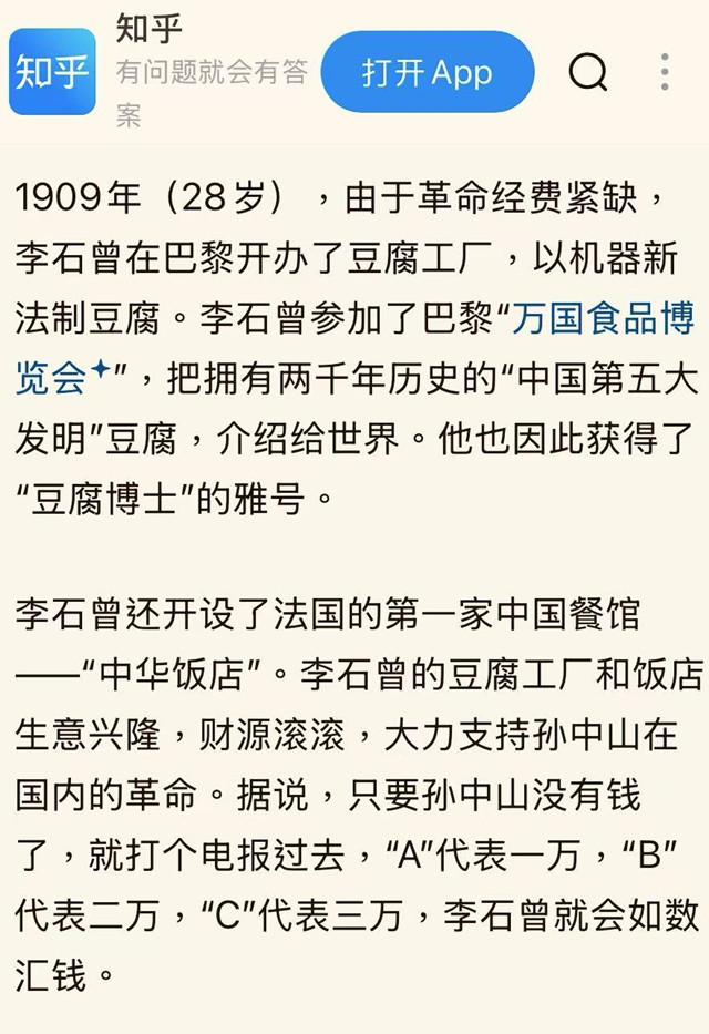 中國的豆腐,賣到外國後,就這樣跟中國的兩次革命,發生了一點不尋常的關係。前後數十年間,充裕革命黨庫,總數不得而知,分文未還屬實,欠債事證俱在、溫州街恆傑堂(紀念吳敬恆、張人傑之堂,亦即世界社中國同志會舊址)。事經秉公明講,如今人選明理,徵得同志支持,理當出綫當選,豆腐佐粥一味,「風雨同粥」一鍋,用以告慰粥賢、李石曾張靜江,如此一來抵債,萬眾一心期待!