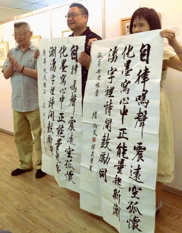 花蓮縣書法學會理事長、花蓮縣美術協會總幹事、花蓮縣洄瀾詩社總幹事及社長、花蓮縣粥會資深粥友王鼎之,專程從花蓮趕來台北参加《自己的鼓聲:廖慶華·曾淑貞正能量詩文書法展》開展雅集,且與同行花蓮6粥友,合影於陸撰並書作前留念,返回花蓮後頃受命和詩句曰:「難有詩書動碧空,正能自鼓在其中。雙才契合開新頁,世界華人一樣同。」步陸炳文將軍韻,祝賀廖慶華院長、曾淑貞老師詩書聯展。