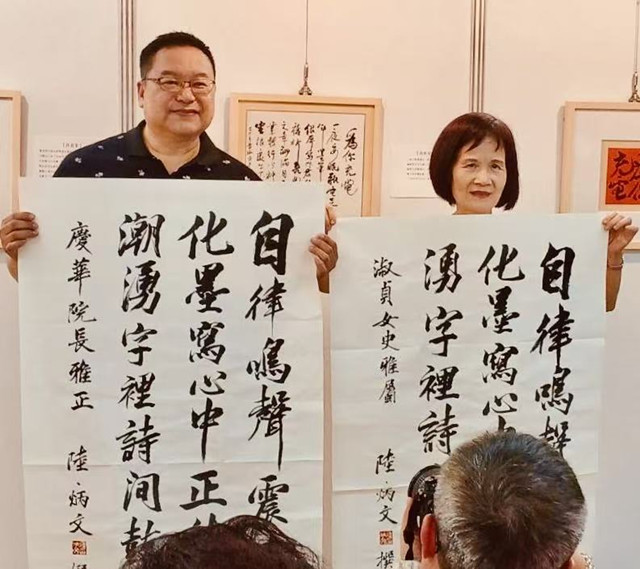 陸炳文並於講完話之後,下臺前展示出文化素養,特别向兩位展出人,也就是廖慶華院長、與曾淑貞主任委員,分別贈送了內容相同、落款迥異之賀詩書作:「自律鳴聲震遠空,孤懷化墨寫心中。正能量起新潮湧,字裡詩間鼓勵同。」藉此印證相互提升正能量,如同利用【自己的鼓聲】激勵,有助於致力正向教導技藝,為你我充電投下大量功夫;同時見證擁有正能量功力,有如報以熱烈的掌聲叫好,有益於彼此產生鼓舞鼓勵,合意投注入巨大精力工夫。