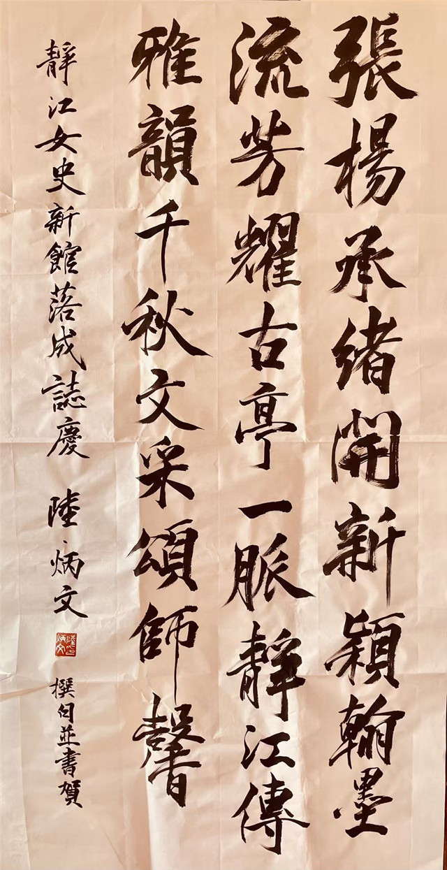 兩位靜江,一男一女,世代交替,前後輝映,張楊張揚,靜江靜好!適值楊靜江的新會館,今舉行落成啟用儀式,總長陸博士偕諸粥友,包括臺北市中華粥會、理事長彭士彭博士等,文藝界舊雨新知近百,當眾宣布聘楊女士為、全球粥會榮譽總會長,同時致贈她詩作書法。