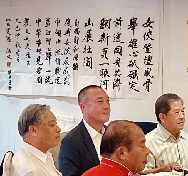 那我們又該怎麼辦?陸炳文前詩吐心聲:「女俠登壇風骨舉,雄心砥礪定前途。同舟共濟翻新頁,一脈河山展壯圖。」自唱自和原韻再作:「復興女俠展威武,巾幗中流領戰途。藍白同心歸一統,中華雄起見宏圖。」當場面陳女俠、麗文女史雅正,乙巳仲秋吉日,八三叟陸炳文,撰並書贈款識。