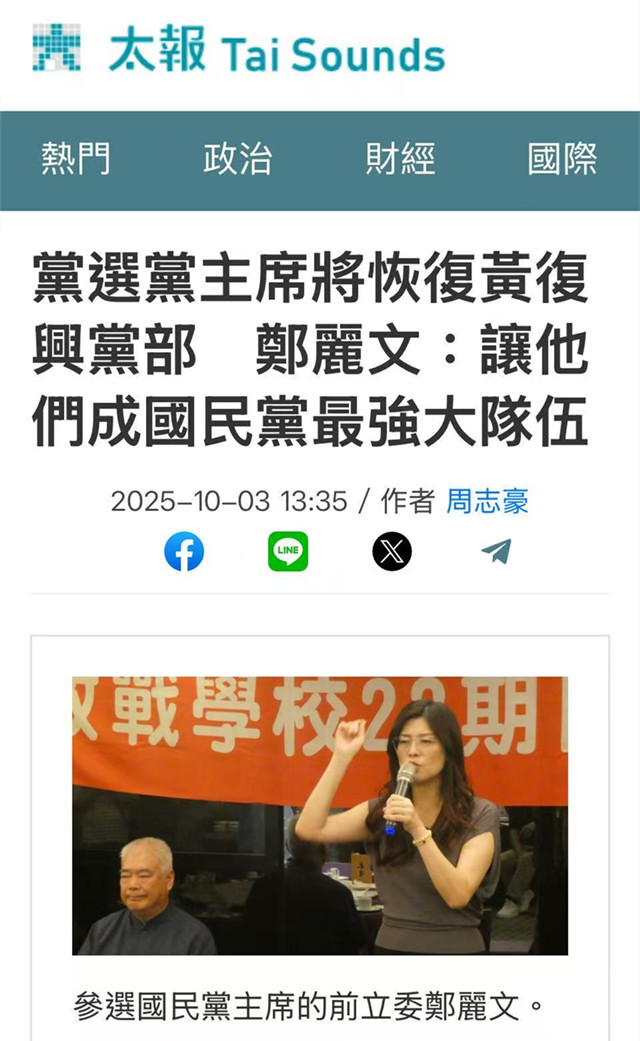 太報即時新聞,今天3日以〈黨選黨主席將恢復黃復興黨部 鄭麗文:讓他們成國民黨最強大隊伍〉為題報導:國民黨主席選舉混戰,主要候選人均力拚軍系支持,是否恢復黃復興黨部也成焦點。主席候選人鄭麗文今表示,當選主席不只是恢復黃復興黨部,還要重建他們的光榮與榮耀,重新整合組織,讓他們成國民黨最強大隊伍。