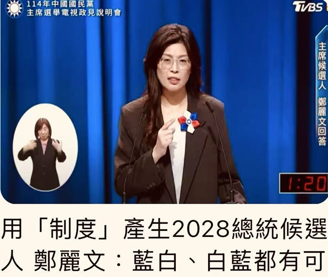 三立新聞報導:國民黨主席選舉今(12日)舉行北部場政見發表會,候選人鄭麗文提到,2026藍白合,台北市有最帥、最優秀的蔣萬安擔任市長,但希望之後選舉不要再三腳督、變數一大堆,因此,她要團結藍白在野力量,力挺蔣萬安順利連任;而新北市長國民黨也有最優秀的候選人,只有國民黨才有能力執政,帶給市民最佳表現。未來擔任黨主席,首要目的將先穩住北北基桃,「不可以有任何狀況,要順利連任」,之後深入翻轉南台灣,讓南台灣再現青天。