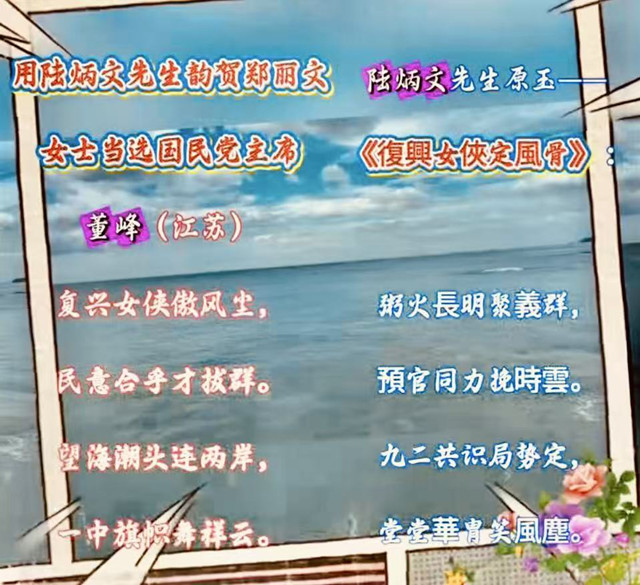 炳公詩曰:「粥火長明聚義群,預官同力挽時雲。九二共識局勢定,堂堂華胄笑風塵。」嗣承《用陸炳文先生韻賀鄭麗文女士當選國民黨主席》,全球粥會榮譽總會長董峰和詩,七言句云:「復興女俠傲風塵,民意合乎才拔群。望海潮頭連兩岸,一中旗幟舞祥雲。」