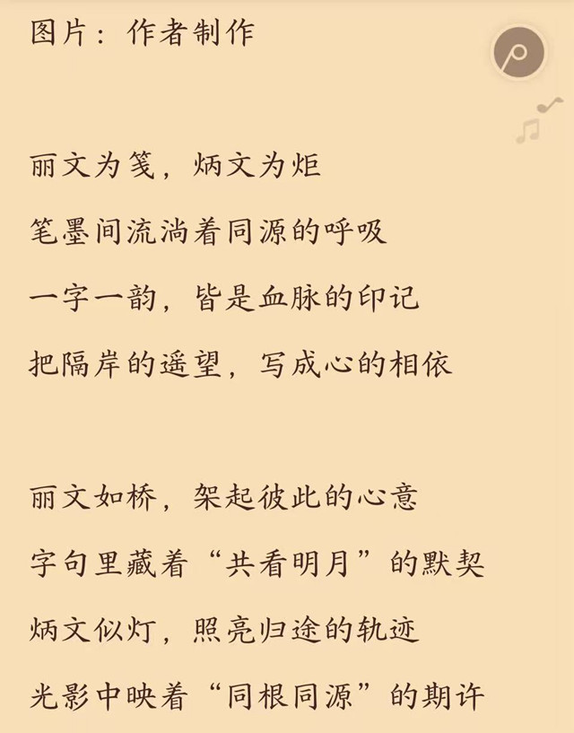 麗文為箋,炳文為炬/筆墨間流淌著同源的呼吸/一字一韻,皆是血脈的印記/把隔岸的遙望,寫成心的相依。麗文如橋,架起彼此的心意/字句裡藏著“共看明月”的默契/炳文似燈,照亮歸途的軌跡/光影中映著“同根同源”的期許。
