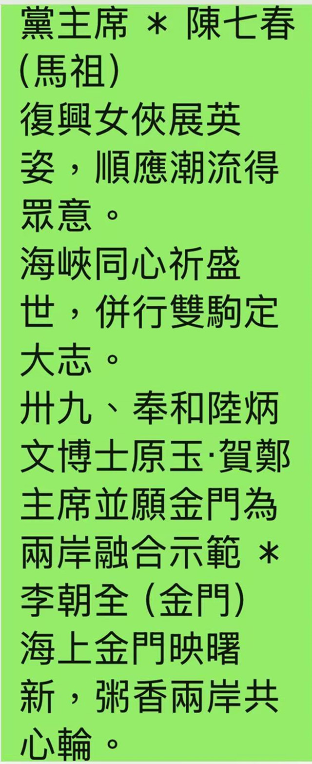 這一首賀詩,不同於賀電,尚且是臺灣地區第一位響應我的創舉,以詩賀當選人而率先用題、《和陸炳文賀鄭麗文榮膺國民黨主席原玉》,詩云:「巾幗英雄鶴眾群,榮膺重任叱風雲。協和兩岸繁經濟,華冑振興蘄掃塵。」共創詩賀當選人之先!共管領騷壇文人之光!陸炳文今豪語。
