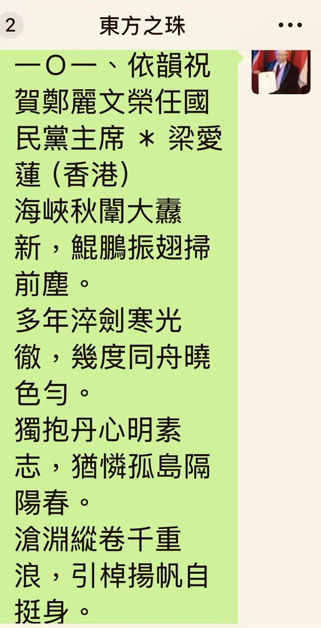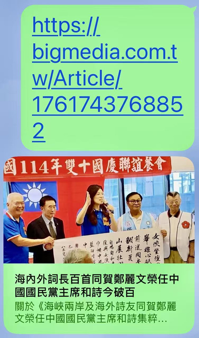 【鉅聞天下】旋即在29號晚間9時許,頭題以〈海內外詞長百首同賀鄭麗文榮任中國國民黨主席和詩今破百〉為圖文,刊登仝賀鄭麗文相關訊息,就任國民黨主席百詩集粹已逾百首,好好聽首先報喜好消息全文如下: