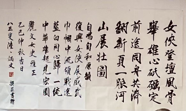 2、〈讃麗文威武大義與志業承擔》:「女俠登壇風骨舉,雄心砥礪定前途。同舟共濟翻新頁,一脈河山展壯圖。」
