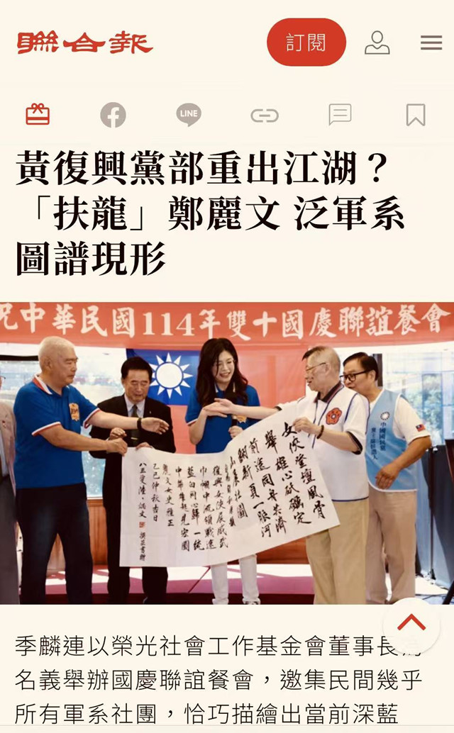 1、〈力挺鄭麗文最適任國民黨魁〉:「復興女俠展威武,巾幗中流領戰途。藍白同心歸一統,中華雄起見宏圖。」