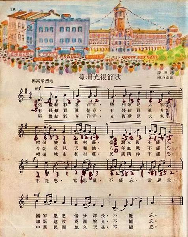06、《光復紀念歌不忘年》:「光復歌聲動海天,童心燈火照當年。半生又製視頻日,片曲依然耳畔旋。」