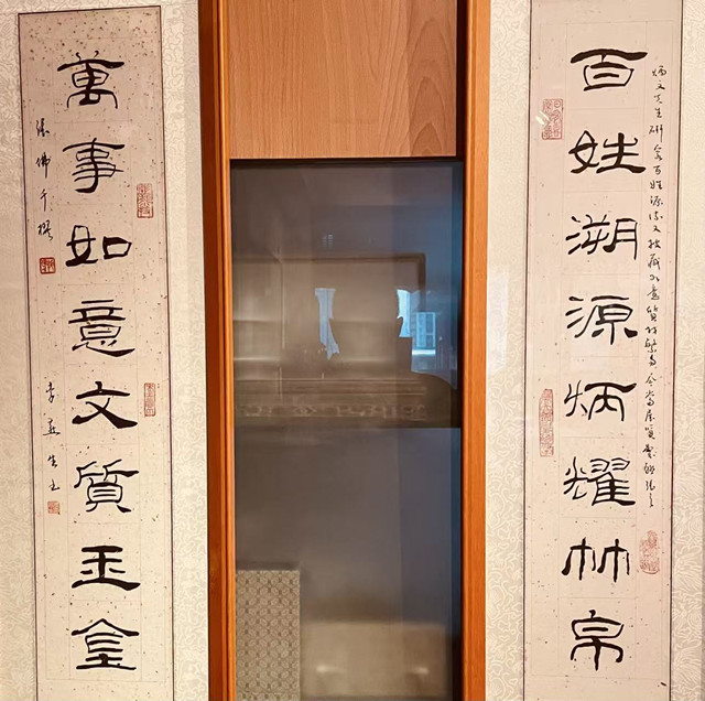 如今回憶張伯伯佛老賜《如意對聯》,陸炳文時任行政院參事,歲朝60甲子正策展「千禧如意」於台北國父紀念館,賀聯遂云:「百姓溯源,“炳”耀林帛;萬事如意,“文”質玉金」。撰句上款註記:「炳文先生研究百家姓源流,又搜藏如意,質材繁多,今當展覽,製聯張之」;佛老並著請李燕生書寫申賀。按說佛老作品,楹聯對句內容,多由他擬妥後,再請幾位書法家,有如李燕生、劉建余和董開章等粥會名賢,以小楷代筆書作,再分送友好惠存。