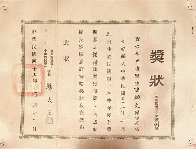 回想當年朗讀比賽前一周,必在中山公園逗留十分鐘,熟讀强背朗誦《國父紀念歌》詞,三段共144字背的滾瓜爛熟,幾乎可以倒背如流而不打嗝,比賽結果出爐果真不出所料,陸炳文探囊取物般拿第一名,並不僥倖而榮獲校長頒給獎狀,時在1954年6月11日,這是77年前起朗讀老歌好處,之後演說講話再也無人能及。