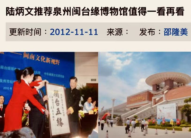海峽兩岸和諧文化交流協進會創會會長、全球粥會總會長陸炳文,與中國閩台緣博物館(以下簡稱「閩台緣」)最早結緣於2009年4月中旬,“第一次全球粥友聯誼大會”、也就是“第2屆兩岸和諧文化節”,在福建泉州召開後,始有首訪參觀行程,此一大陸唯一全面十足反映、閩台關係的國家一級博物館裡,得睹珍藏風俗文物,被那種既熟悉又陌生、閩南風情所懾人心魄。