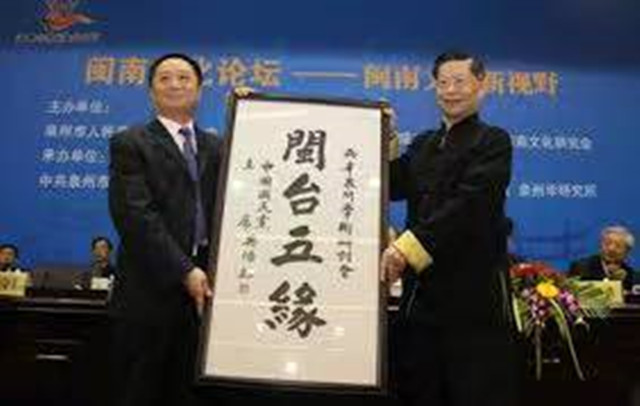 2010年2月28日,參會首屆海峽兩岸閩南文化節、重頭戲“閩南文化論壇”,在「閩台緣」學術報告廳舉行開幕式上,先向館長楊彥傑轉贈了中國國民黨榮譽主席吳伯雄題詞“閩台五緣”,再以《閩南文化在國族和諧上之匯合》為題,發表了主旨演說。