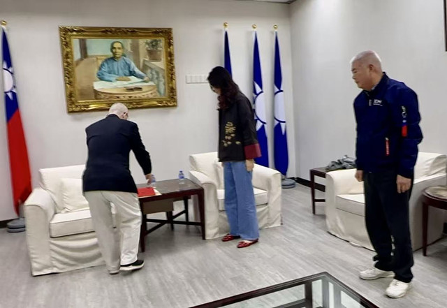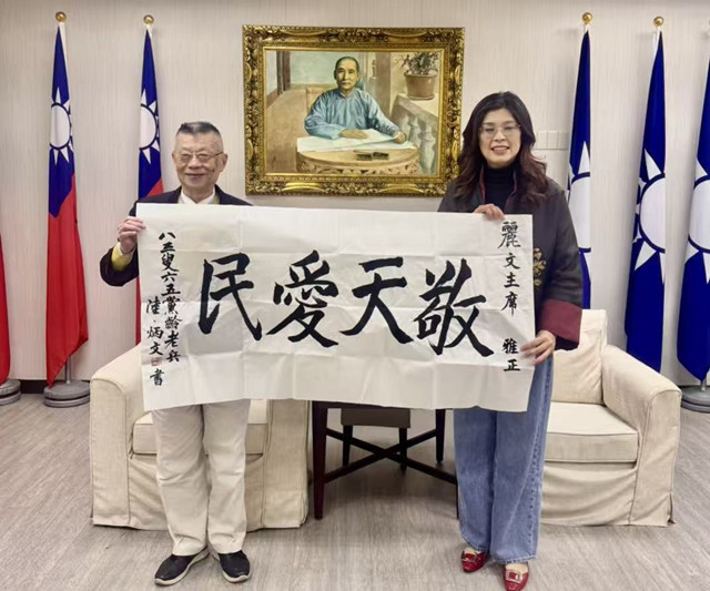 中國國民黨主席鄭麗文,2026年2月11號、就任黨魁「百日維新」後三天吉時、星期三下午三時許、主持中常會結束後,在副主席季麟連上將陪同下,於中央黨部貴賓會客室,接見了全球粥會總會長、于右任書法收藏研究院院長陸炳文博士,台灣文化藝術界聯合會理事主席、全球粥會總會監事長朱明月教授,並受贈兩幅賀詞書法作品。