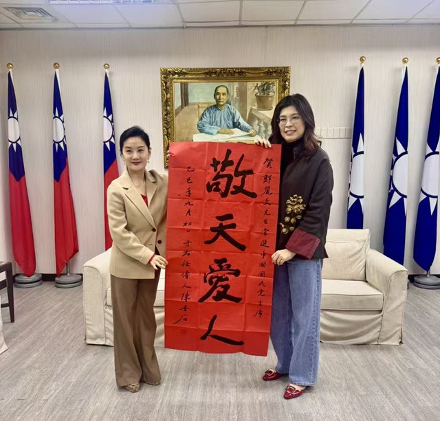 昨天百忙之中,國民黨主席鄭麗文,在台北會見了全球粥會總會長陸炳文博士,及台灣文聯主席朱明月教授,當場接受陸博士贈送書法作品《敬天愛民》申賀,並由朱主席代表于右任傳人陳墨石賀詞《敬天愛人》墨寶,副主席季麟連上將等在場,見證鄭主席「百日維新」後三天,具有獨特歷史性的這一時刻!