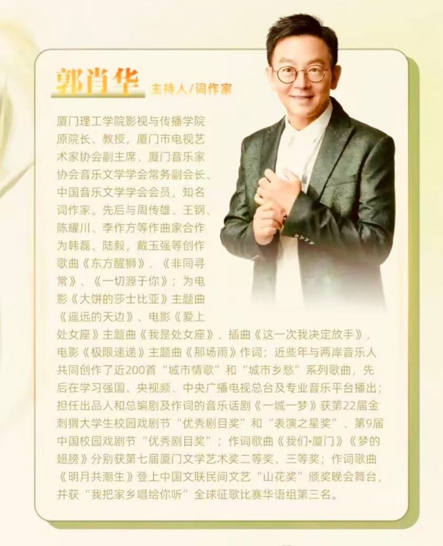 此次在鼓浪嶼舉辦的音樂故事會,可謂群英薈萃、情誼交融,既有音符的流動,也有文字的溫度,更有朋友相聚、藝術相知的美好時光。相信在眾多創作者、歌者與聽眾的共同參與下,這場春分之夜的音樂雅集,必將唱響城市記憶、喚起人心共鳴,為兩岸文化藝術交流再添一段動人的旋律。謹此遙致誠摯祝賀,祝願《春日時分——郭肖華和他的朋友》原創音樂故事會圓滿成功,歌聲遠播、情誼長存,讓藝術之花在海峽兩岸四時常開,餘音繚繞不絕於耳長鳴海西海東!