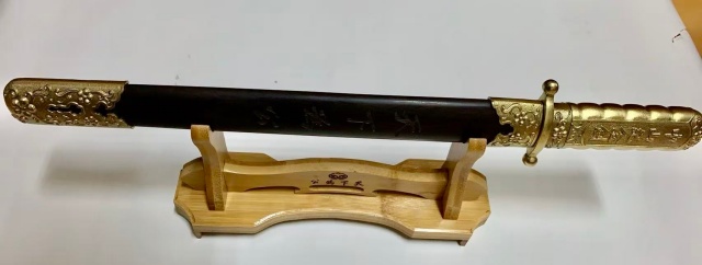 日前,果然再收到鑄劍人百劍生信息:中山紀念劍業已完成!請陸總長及朱監事長明月主席(台灣文聯),一起撥個時間見面、討論。先拍照片給你過目,寶劍長34±003公分,樣品劍編號"中 SJ-160-001-A",全套含附配件,1、錦盒:高級紅木+烤漆、金字(大道之行 天下為公 孫中山誕生160週年紀念劍)。2、劍鞘:黑檀木。3、銅配件:精雕吉祥紋。4、刃材:高合金花紋鋼材、微開刃。5、劍把:精鋼,鐫有"中山紀念劍"五字。6、劍座:黃楊木,印有全球粥會如意到徽章等6大件。