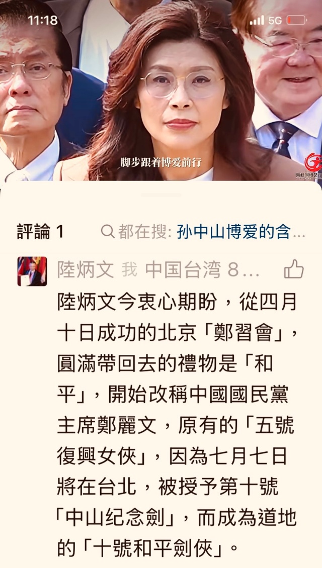 陸炳文今衷心期盼,從四月十日成功的北京「鄭習會」,圓滿帶回去的禮物是「和平」,開始改稱中國國民黨主席鄭麗文,原有的「五號復興女俠」,因為七月七日將在台北,被授予第十號「中山纪念劍」,而成為道地的「十號和平劍俠」。