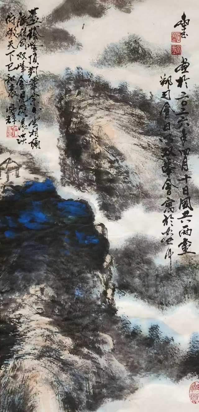 一、〈雲隔同源〉:墨嶺蒼茫勢欲騰,藍陰深處見光行。白雲半掩雙峰立,遠脈相連一氣承。淡染濃皴涵古意,虛空實境伴生成。俯看塵世多紛擾,俯仰無言誰可憑。