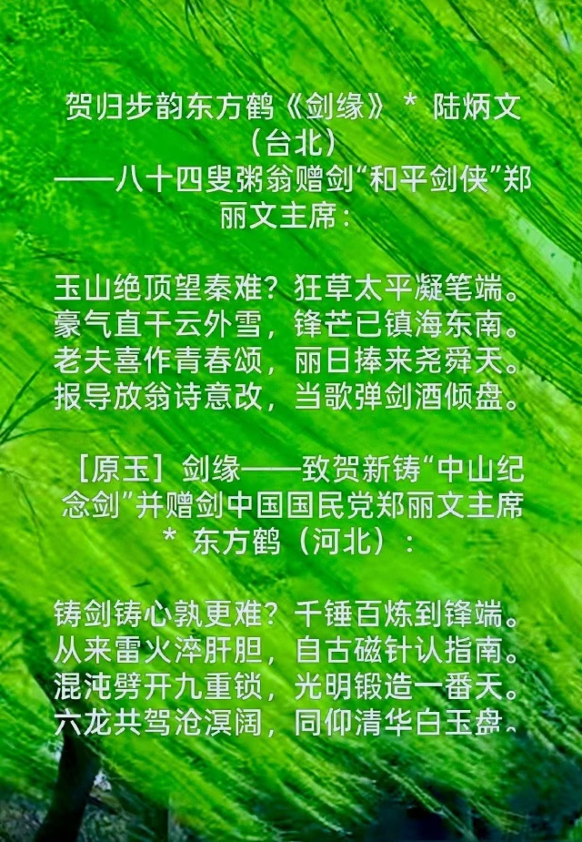 12日,鄭麗文主席業已率同國民黨訪問團,結束為期6天的大陸參訪行程,陸炳文等除了用詩句祝賀歸來:「玉山絕頂望秦難?狂草太平凝筆端。豪氣直干雲外雪,鋒芒已鎮海東南。老夫喜作青春頌,麗日捧來堯舜天。報導放翁詩意改,當歌彈劍酒傾盤。」有感於茶劍高掛共享天成,不離和諧共生人功而結語: