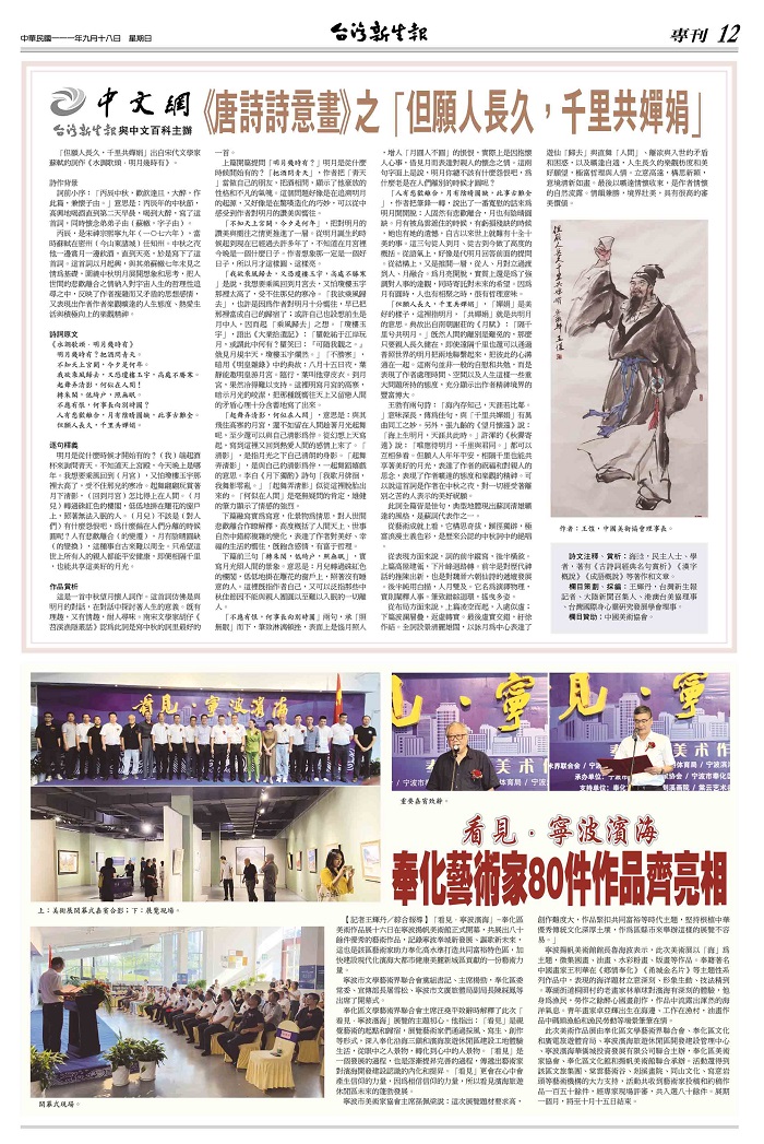 【記者王輝丹/綜合報導】「看見‧寧波濱海」-奉化區美術作品展十六日在寧波揚帆美術館正式開幕,共展出八十餘件優秀的藝術作品,記錄寧波奉城新發展、謳歌新未來,這也是該區藝術家助力奉化高水準打造共同富裕特色區,加快建設現代化濱海大都市健康美麗新城區貢獻的一份藝術力量。