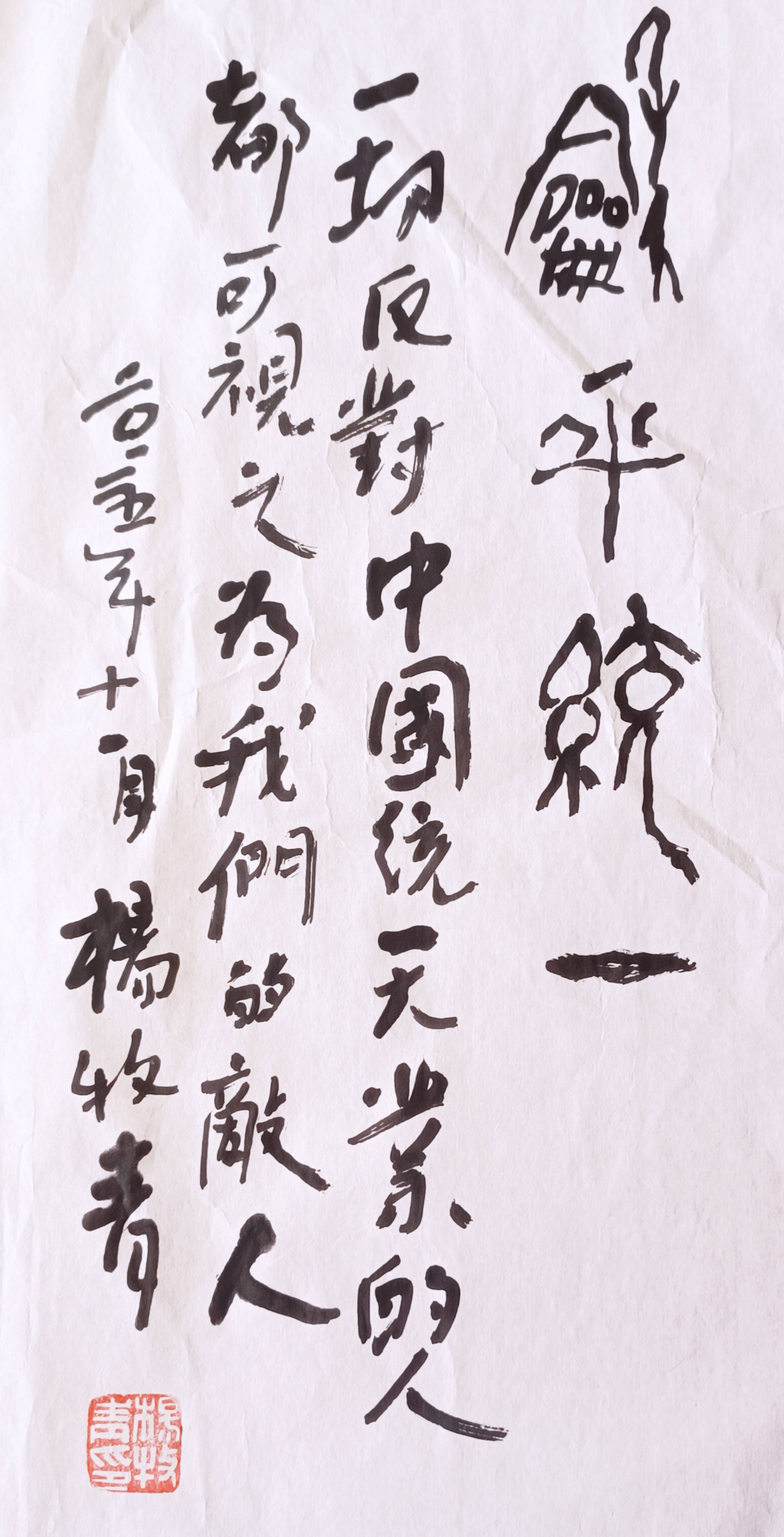 款识:一切反对中国统一大业的人,都可视之为我们的敌人!二O二五年十一月杨牧青