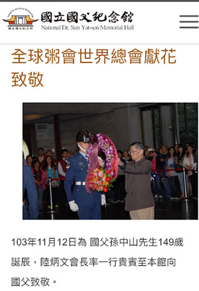 2016年3月12號,孫中山逝世93周年、暨孫科首次訪台70周年紀念日,配合台北國父紀念館,頭一回辦理「全民向國父致敬活動」,需求我們中華粥會、中華將軍教授書畫院、孫中山文化研究中心等3個單位,共同組成16人代表團,前往仁愛路中山館正廳,向孫扶道人坐像行禮獻花致敬,接著舉行紀念粥會雅集,及召開「兩岸同行中山路」活動,展開籌備策劃先期分工作業。大展身手之前的、2013年10月8日,孫穗芳亦拜訪過國父館,安排同樣的行禮儀式,携其子王祖耀二位僑胞,向先祖銅像獻花致祭,陸炳文則前後十年間,共六回偕同道近百人,恭向孫文像獻花致敬,中山華僑“十全十緣之八”因此得以先後呼應。