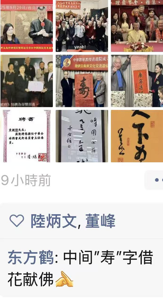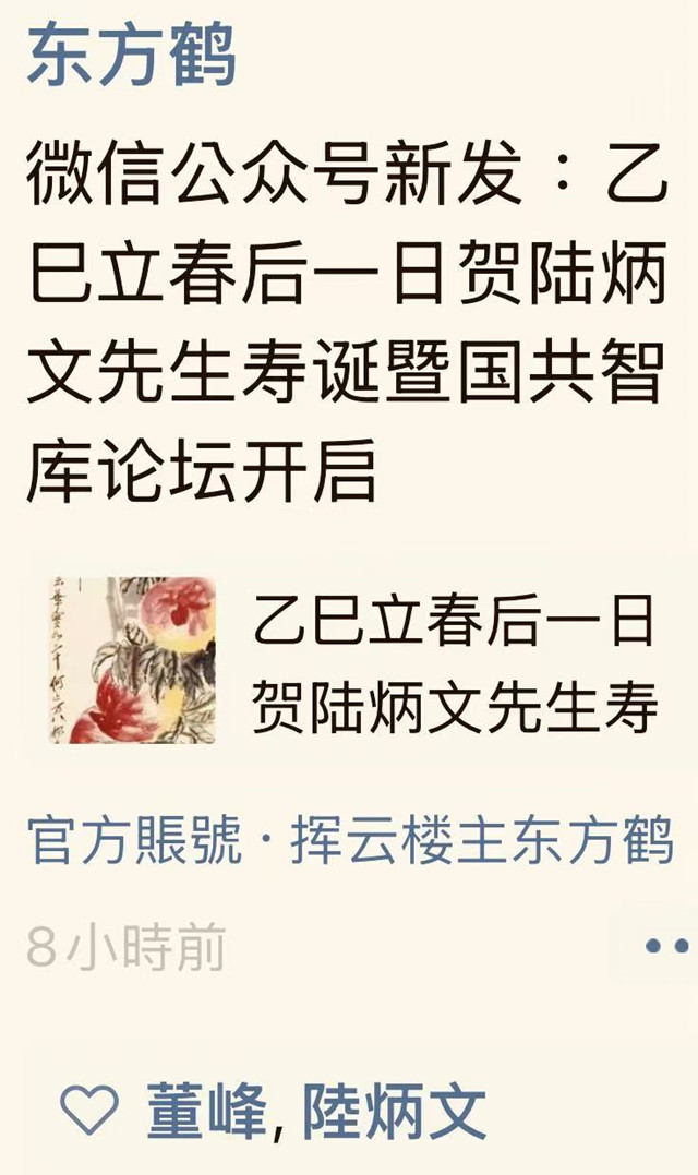 頃接詞長東方鶴感賦回應,詩題《乙巳立春後一日賀陸炳文先生壽誕暨國共兩黨智庫論壇開啟》,句云:「當年劍氣化星文,今見虹霓貫紫氛。華岳曾支滄海柱,六龍紛駕太平輪。已斟玉露酬蘭契,更借天風掃舊塵。待到蟠桃又紅透,雲程九萬月一襟。」陸博士在良晨,謹謝詞長意,珠玉賀詩,氣象萬千,情誼深長。以劍化文、以和致遠,既慰生日喜樂之心,亦壯兩岸和諧之願,珍藏再拜,兼代答覆。