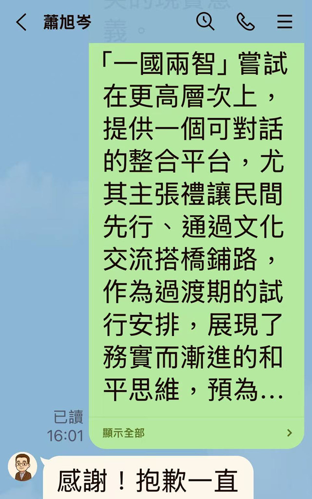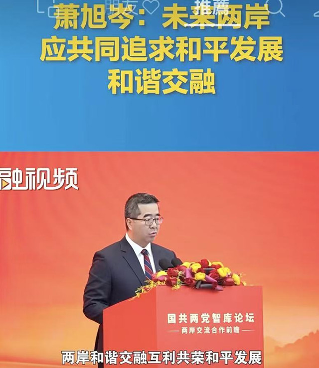 2、「和諧冇統一」:論壇致詞時蕭旭岑强調:「兩岸大交流、大合作,兩岸“和諧”交融,互利共融,和平發展最符合兩岸人民的共同利益。我深切期許,未來兩岸應該以確保人民福祉為最大目標,堅持“九二共識”,反對“台獨”,求同存異,擱置爭議,共創雙贏。共同追求和平發展,“和諧”交融,兩岸攜手合作,振興中華,讓中華民族在全世界人民面前,抬頭挺胸。」