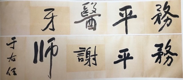 另悉,帝圖藝術今歲春拍,亦有意專向陸炳文,徵求一些物件上拍,其中不乏粥會文物,最引人關注的一件,今天首度公開藏家。此即“謝務平牙醫師”長卷,博士幸運取之有道,30年前某個禮拜天,趁著拂曉去臺北福和橋下,趕集處撿漏掏寶時,驚見一堆個字,用舊報紙捲起,內共8張于書,大小不一模造紙,湊句似為「謝、務、平、牙、醫、師、務平、于右任(含鈐印)」,顯然是受託於人情,信筆寫下應酬之作,後被不明人士釋出,嗣經如獲至寶購入,重組一句「務平醫牙,務平謝師。于右任(含鈐印)」付裱長卷,就成了一件既有意義,又具獨特價值的逸品。
