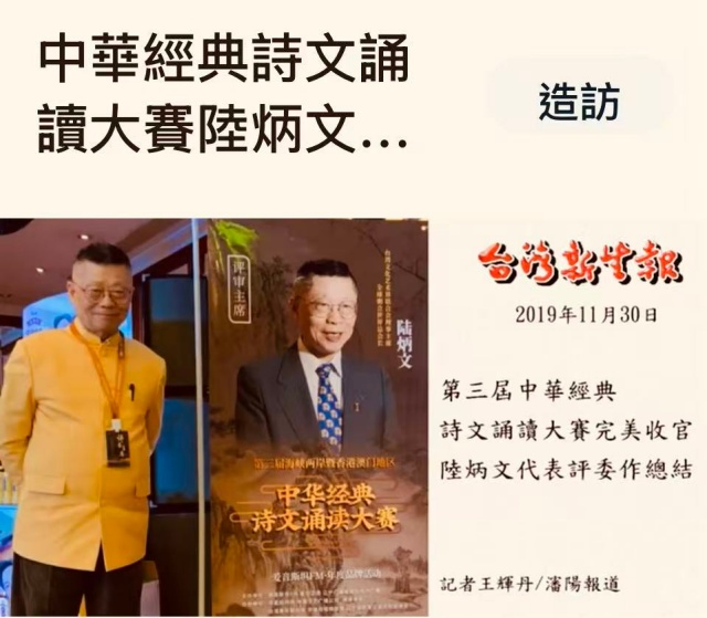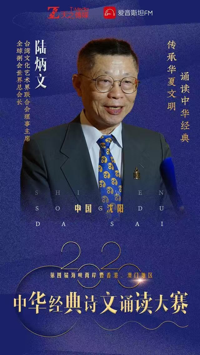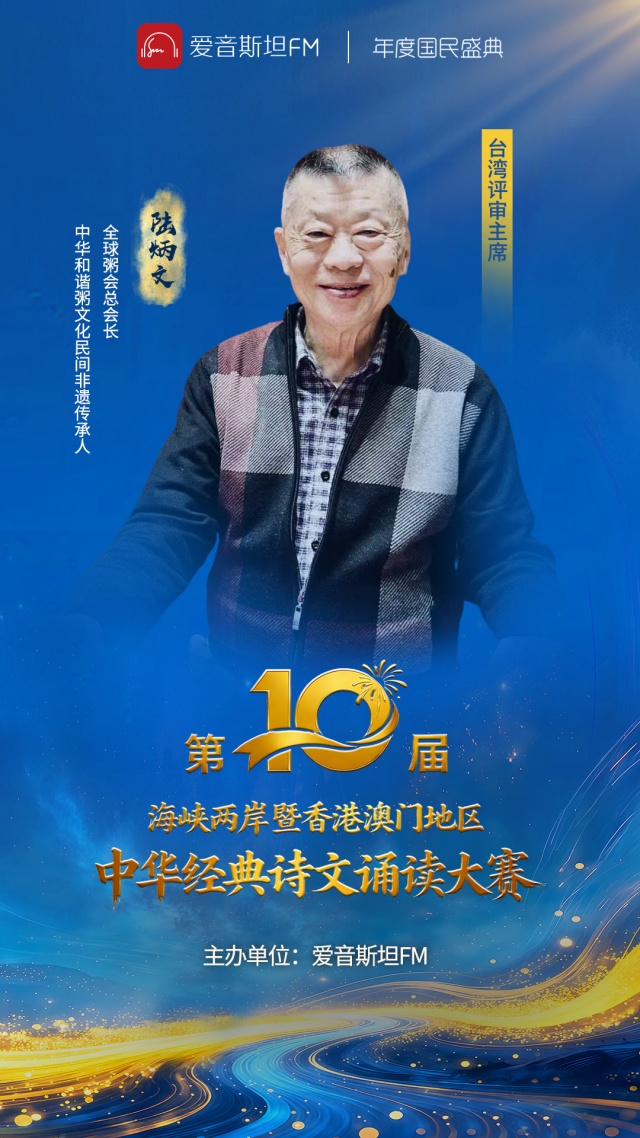 2026年第10屆海峽兩岸暨香港、澳門地區中華經典詩文誦讀大賽的,主視覺及嘉賓海報,12日確定並已出臺,經主辦單位愛音斯坦FM,把設計稿第一時間傳來臺北,分別給了台灣評審主席陸炳文(中華和諧粥文化民間非遺傳承人、全球粥會總會長),和評委、表演嘉賓朱明月(兩岸知名戲曲表演藝術家、臺灣文化藝術界聯合會理事主席),且謂每年我們特邀嘉賓的海報,都與大賽活動海報風格完全一致。