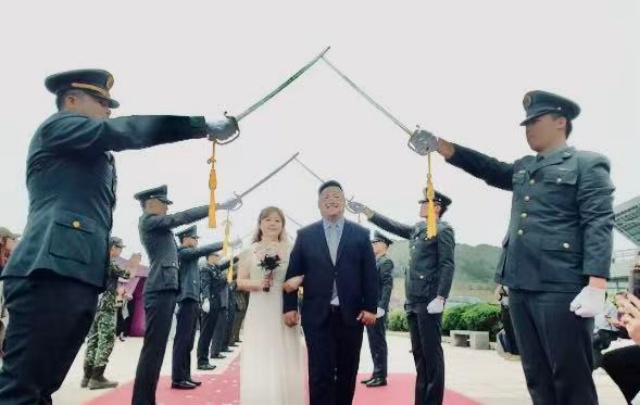 2. 軍官婚禮:堅定與守護。軍官結婚之際,申請「劍門」儀式,禮門下走紅毯,乃國軍的一項特色傳統,展現出軍人的威儀、與對伴侶的承諾。劍門組成:婚禮劍門,通常由新郎的同學、或軍中同袍組成。持劍者身著大禮服,兩人一組相對而立,在新郎新娘進場或退場時,依序將軍刀上舉交叉成拱門,如此單手高舉長劍,組成八道「劍門」禮下進場,具有「雙劍合璧」、「雙喜臨門」寓意,參加新人依序穿越,喜氣越來越發越好。