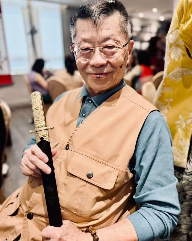 ——八十四叟粥翁贈劍“和平劍俠”鄭麗文主席:「玉山絕頂望秦難?狂草太平凝筆端。豪氣直干雲外雪,鋒芒已鎮海東南。老夫喜作青春頌,麗日捧來堯舜天。報導放翁詩意改,當歌彈劍酒傾盤。」