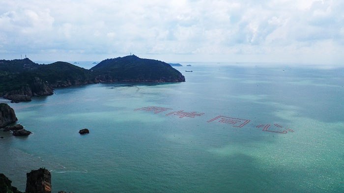圖說:洞頭半屏山前,「兩岸同心」四個字浮於的海上,盼架起溫臺同心橋。