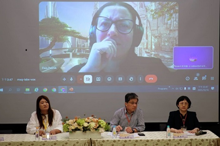 圖 /成大藝研所研究生吳婉綾、華山文創園區藝文總監林璞副教授、成大戲劇碩胡紫雲約聘助理教授共同與線上的波蘭華沙大學漢學系裴恩文主任對談。(圖/成功大學文學院跨領域戲劇學分學程 提供)