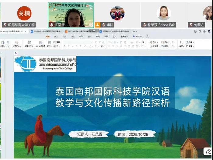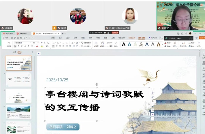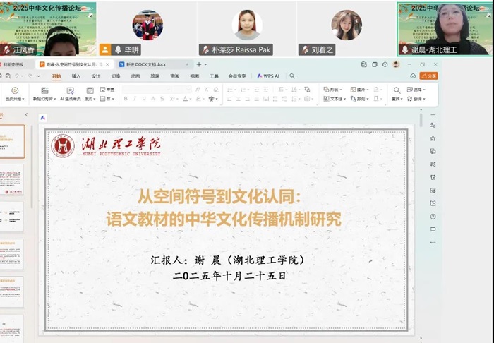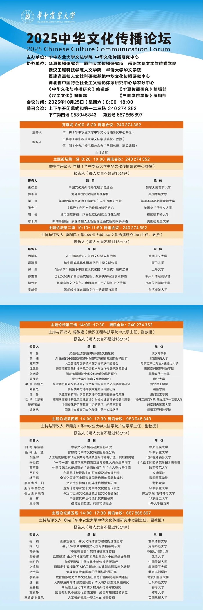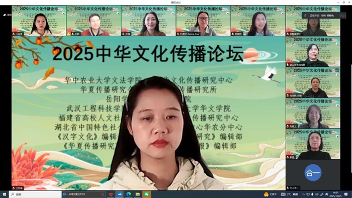 2025 年 10 月 25 日,由華中農業大學文法學院、中華文化傳播研究中心聯合主辦,華夏傳播研究會、廈門大學傳播研究所、岳陽學院文學與傳媒學院、武漢工程科技學院人文學院、華僑大學華文學院、福建省高校人文社科研究基地中華文化傳播研究中心、湖北省中國特色社會主義理論體系研究中心華農分中心及《中華文化與傳播研究》、《華夏傳播研究》、《漢字文化》、《三明學院學報》四刊編輯部共同協辦的 2025 中華文化傳播國際論壇,以 “線下 + 線上” 融合模式順利召開。