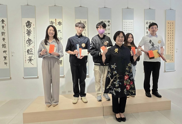 和氣大愛文教基金會董事長段傳芬(前)與大專社會組前三名得獎人合影留念。