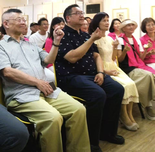 花蓮縣書法學會理事長、花蓮縣美術協會總幹事、花蓮縣洄瀾詩社總幹事及社長、花蓮縣粥會資深粥友王鼎之,專程從花蓮趕來台北参加《自己的鼓聲:廖慶華·曾淑貞正能量詩文書法展》開展雅集,且與同行花蓮6粥友,合影於陸撰並書作前留念,返回花蓮後頃受命和詩句曰:「難有詩書動碧空,正能自鼓在其中。雙才契合開新頁,世界華人一樣同。」步陸炳文將軍韻,祝賀廖慶華院長、曾淑貞老師詩書聯展。
