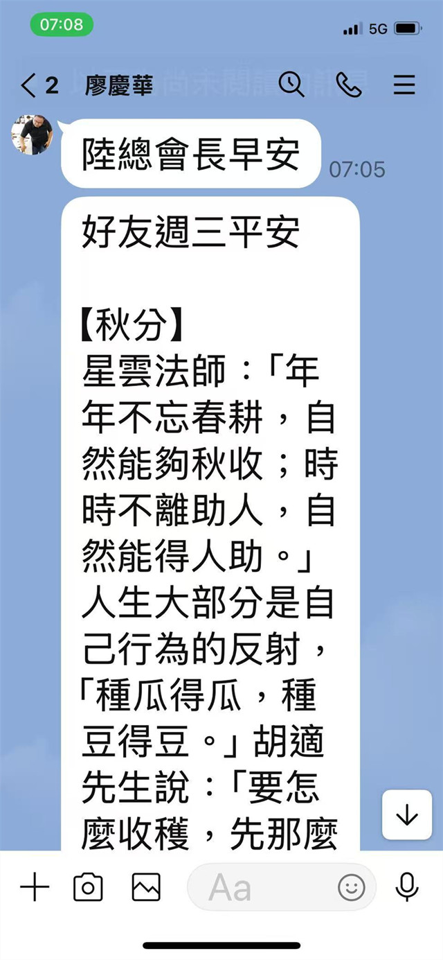 陸博士今日早起,收到國立東華大學藝術與設計學系教授兼藝術學院廖慶華院長,例用萊茵LINE問候:陸總會長早安,附上短文【秋分】,星雲法師:「年年不忘春耕,自然能夠秋收;時時不離助人,自然能得人助。」人生大部分是自己行為的反射,「種瓜得瓜,種豆得豆。」胡適先生說:「要怎麼收穫,先那麼栽。」我們做好事,不是為了得好報,但是好報還是會回我們身上。善待別人就是善待自己。(廖慶華)