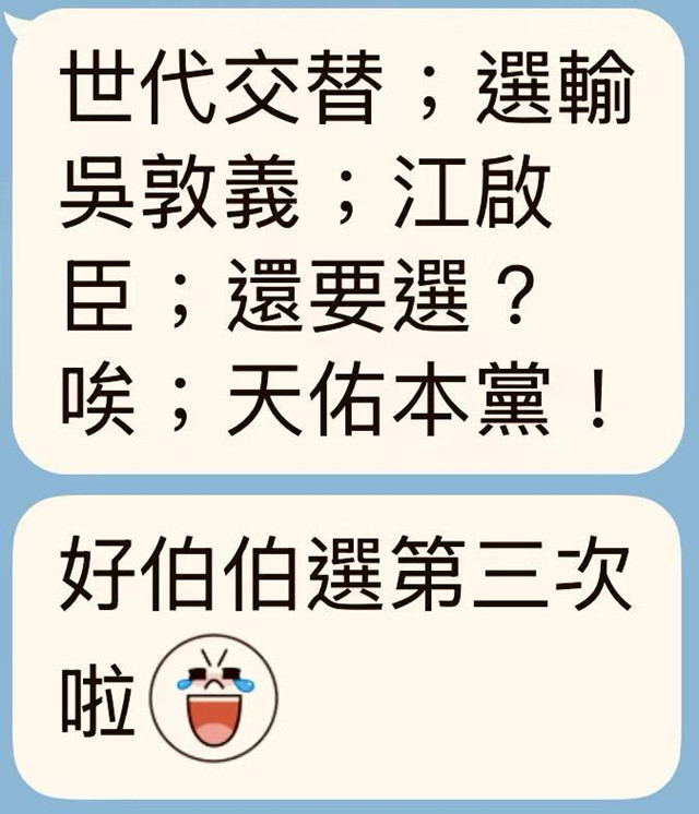 例如曾任中央民意代表甲君稱:小弟我追隨敬愛的、陸教授炳文大哥大,奉陸大人旨意、支持鄭麗文,恭請聖裁;百分之廿五尚“未定”人選者,猶樂見優秀人選會出線,有如某社團負責人乙君,風度極佳表示:陸老師好,「兄弟爬山,各自努力」;僅不到百分之二“否定”適任者,像是丙君態度較差,竟然放肆出言不遜,老友似乎情有可愿,衝動良堪予以憫恕。