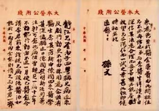 第二封、1924年6月15日所寫,信中寫道:「內子回粵稱:兄病近來反劇,行動更不自由,殊用為念。茲有醫生李其芳,新由德國回來,醫學甚深。據稱近日德國發明新法用藥注射,可愈此病。彼曾親見一病十二年不能行動者,不過一月便已醫愈。今請李君前來診視兄病,設法醫治,如能於一兩月內痊癒,則請兄與李君一齊來粵為荷?至於醫金藥費,由此間擔任,兄不必再給也。弟與李醫生詳談半日,深信其法為合理而妥善,想必能奏奇效,望兄亦深信而一試之。幸甚!」