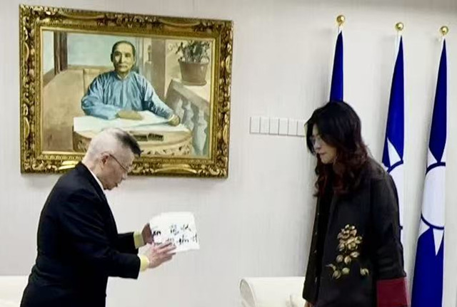 中國國民黨主席鄭麗文,2026年2月11號、就任黨魁「百日維新」後三天吉時、星期三下午三時許、主持中常會結束後,在副主席季麟連上將陪同下,於中央黨部貴賓會客室,接見了全球粥會總會長、于右任書法收藏研究院院長陸炳文博士,台灣文化藝術界聯合會理事主席、全球粥會總會監事長朱明月教授,並受贈兩幅賀詞書法作品。