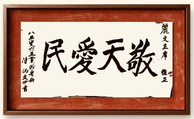 「敬天愛民承古道,粥會傳薪照遠途。敬天愛人融兩岸,粥香墨韻共長天。」作為回應結束語共勉!友人乙君也有同感:「敬天愛民丶敬天愛人,孫逸仙與于右任座右銘也。值此百日維新之際,炳公陸博士書贈鄭麗文主席,期許遵從天命,順從民意,為兩岸人民謀福祉,為中華民族謀復興,立意高遠,情深意切,有季連麟副主席為證,鄭麗文主席受贈,相信會言行一致,踐履篤行,降福於國人!」